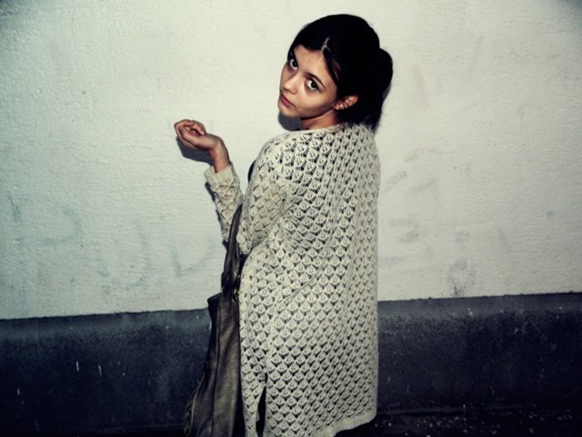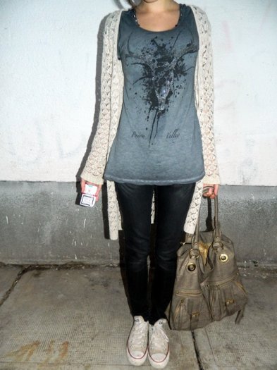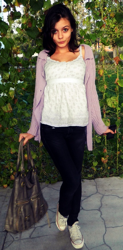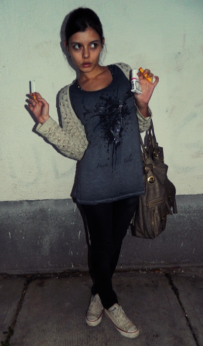 Danas je vreme bilo božanstveno tako da sam se odlučila za krem rupičast džemper koji malo podseća na milje i savršeno se slaže uz neizostavne starke i moju omiljenu torbu koju sam ovaj put okrenula kako treba. Jedino sam se zeznula jer sam uzela tamnu majicu a dan je bio sunčan pa sam se skuvala kao u paklu. Tu majicu mi je dečko poklonio za sedamnaesti rođendan i mnogo sam vezana za nju. Siva je pa se uz sve slaže, a veliki plus su joj nitne na krajevima rukava i na obodu kod grudi. Farmerke su iste kao i juče jer su mi ostale na pranju a i nervira me kad mi vise. Zato izgleda moram da pređem na suknje. Konjski rep sam vezala jer volim svoju kosu pa je nisam oprala a neugodno mi je kad mi masna visi sva u fronclama. Uz današnju kombinaciju sam uklopila i Drinu sarajevsku koja se zbog beline paklice savršeno složila sa ostatkom autfita, i naglasila moj društveni položaj i pripadnost radničkoj klasi, da ne kažem siromaštvu.