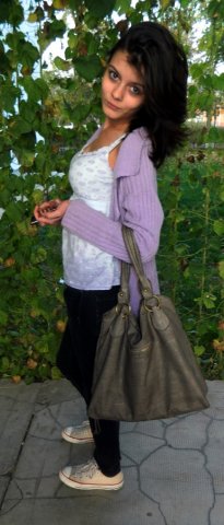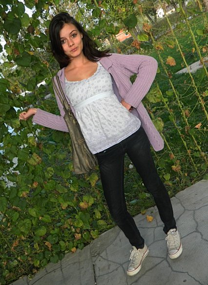 Današnja kombinacija u kojoj sam išla u školu je inspirisana mojim ciklusom, jer sam samo tada kol'ko-tol'ko ženstvena, inače sam pomalo muškarača. Obukla sam ovu božanstvenu belu majičicu sa ljubičastim šaricama, koja je na grudima uska i može prelepo da ih istakne, da kipe, dok se dalje širi i pomalo u njojdelujem kao trudnica. Preko sam obukla mamin prljavo roze džemper (MUŠKARCI BUKVALISTI ODABIJTE, JUČE SAM JE PRALA, NISTE DOVOLJNO FEŠN DA KAPIRATE BOJE), koji savršeno može da oda vašu ranjivost i očaj. Malo sam se zeznula pa sam torbu okrenula naopako, ali ja sam fešn blogerka i ja diktiram trendove tako da zapišite u svojoj glavi "OD DANAS SE TORBE NOSE NAOPAKO!!!" Crne uske farmerke idu uz sve tako da ih ja nosim uz sve jer sam mnogo mršava i sve što pojedem mi ide u grudi (znam da mi zavidite) pa mi sve pantalone, osim ovih, vise. Starke su mast hev uvek i svuda jer to je fešn jes jes. Uz ovu kombinaciju sam uzela i crnu jaknu od skaja koja mi je malo velika jer je to zapravo jakna moje najbolje drugarice, koju, za razliku od mene, ima čovek za šta da u'vati.